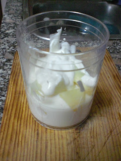 Cortamos el melón en cachos, y lo echamos junto a la leche, y el yogurt al vaso de la batidora. Lo pasamos tod